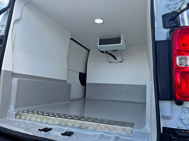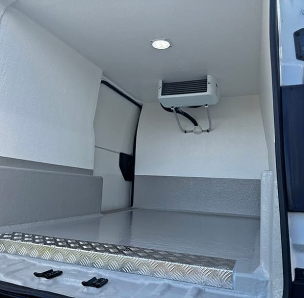 Using a combination of traditional methods and the latest CAD and CNC technology this fridge van is converted to the highest of standards. A lightweight XPS board with a high insulation factor is bonded to plywood, this in turn is fitted into the van and is then overlayed with fibreglass and resin to give immense strength and durability.A smooth, hygienic and easy to clean gel coat is then added; white walls with a grey floor, this along with the high quality recessed lights we fit creates a bright clean looking fridge compartment.