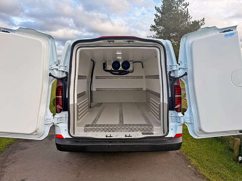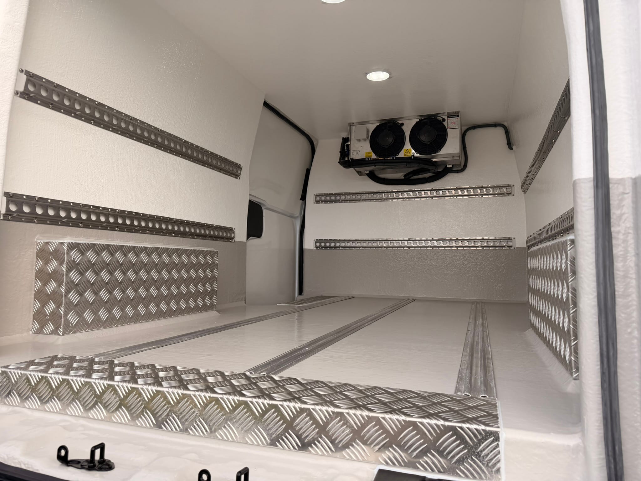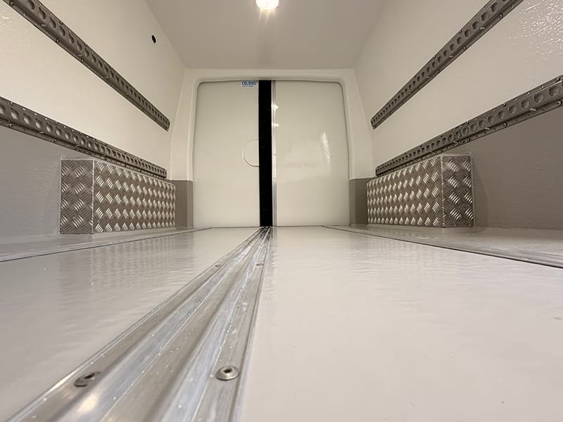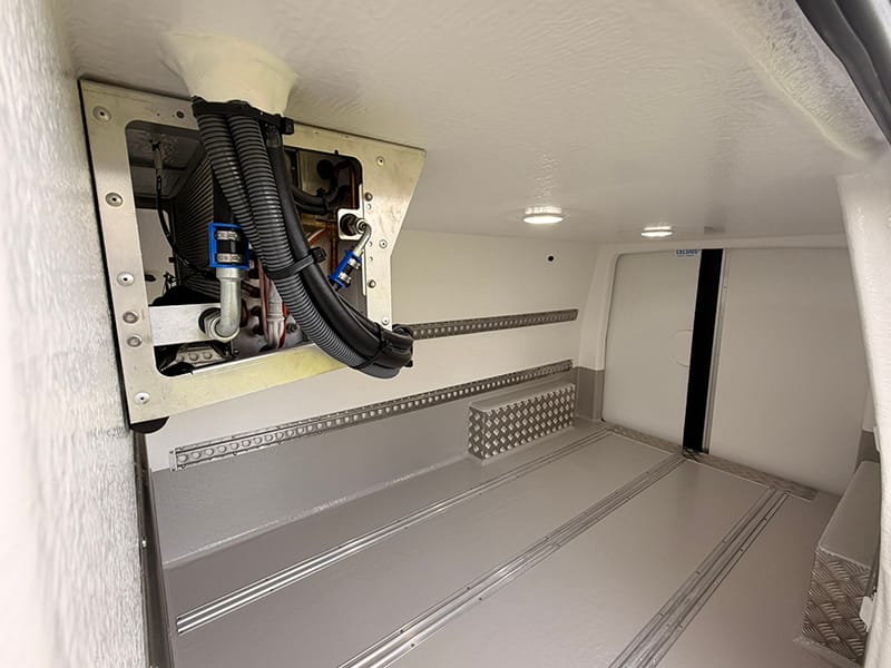 Using a combination of traditional methods and the latest CAD and CNC technology this fridge van is converted to the highest of standards. A lightweight XPS board with a high insulation factor is bonded to plywood, this in turn is fitted into the van and is then overlayed with fibreglass and resin to give immense strength and durability.A smooth, hygienic and easy to clean gel coat is then added; white walls with a grey floor, this along with the high quality recessed lights we fit creates a bright clean looking fridge compartment.